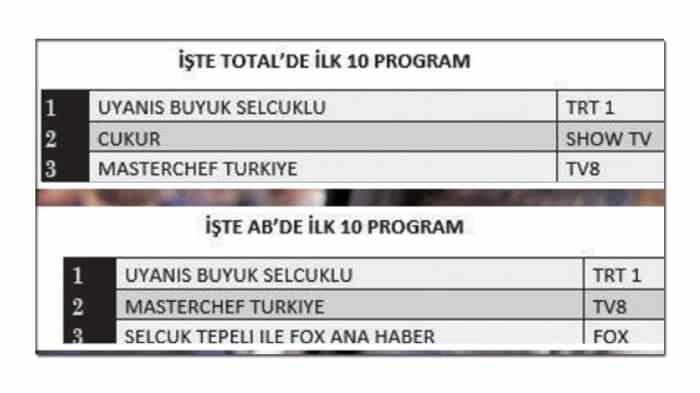 Ekin Koç, Buğra Gülsoy, Hatice Şendil ve Gürkan Uygun’un başrolü olduğu ‘Uyanış: Büyük Selçuklu’ dizisi, yayınlanan reytinglere damgasını vurdu. TRT 1’de yayınlanan dizi, AB ve ‘tüm kişiler’ ölçümlerinde 1. sıraya yerleşti.
